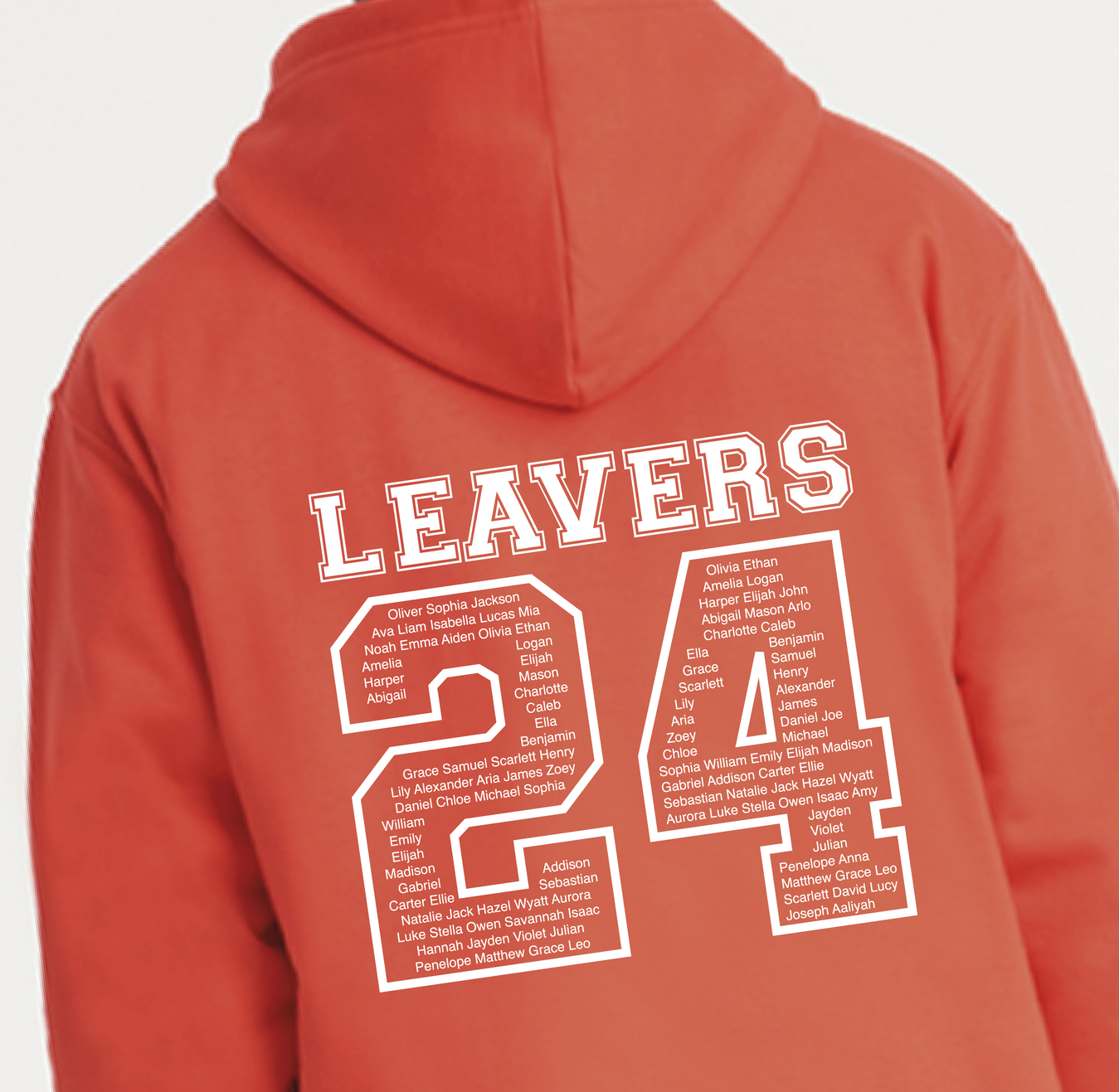 Our leavers hoodies are customisable, allowing students to add personal touches such as their names, nicknames and initials. This makes each hoodie unique and reflective of the wearer's personality.